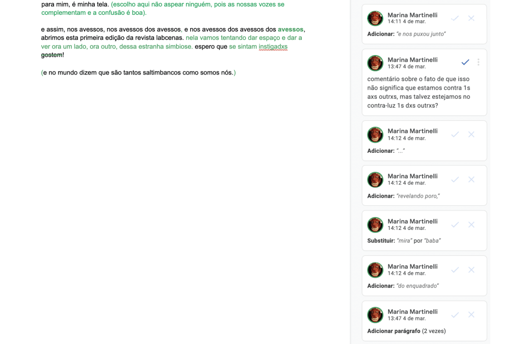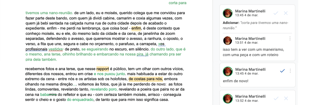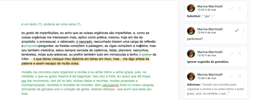 Marina Martinelli é mulher cis, socialmente lida como branca no nordeste e parda no sudeste, natural de Salvador, de peixes, filha de Xangô. no mais, é uma produtorazinha meia-boca, que fez graduação em Letras porque gosta de ler e escrever. se pegou dizendo dia-dêsse que trabalha há pouco tempo com produção, mas se pegou em seguida contando e chegando à conclusão que lá se vão sete anos que botou o pé na profissão e foi entrando, entrando – e essa desculpa de que é novata não cola mais. é mestre em cultura e sociedade pela universidade federal da bahia, com uma pesquisa nada a ver com produção (será?), sobre ethos discursivo de uma casa de candomblé em sua página no facebook. coabita com dois gatos, 72 minhocas canadenses composteiras e algumas poucas plantas que sobrevivem na marra à sua absoluta falta de dedo verde. deu pra dizer recentemente que é artista da palavra. \_O_/